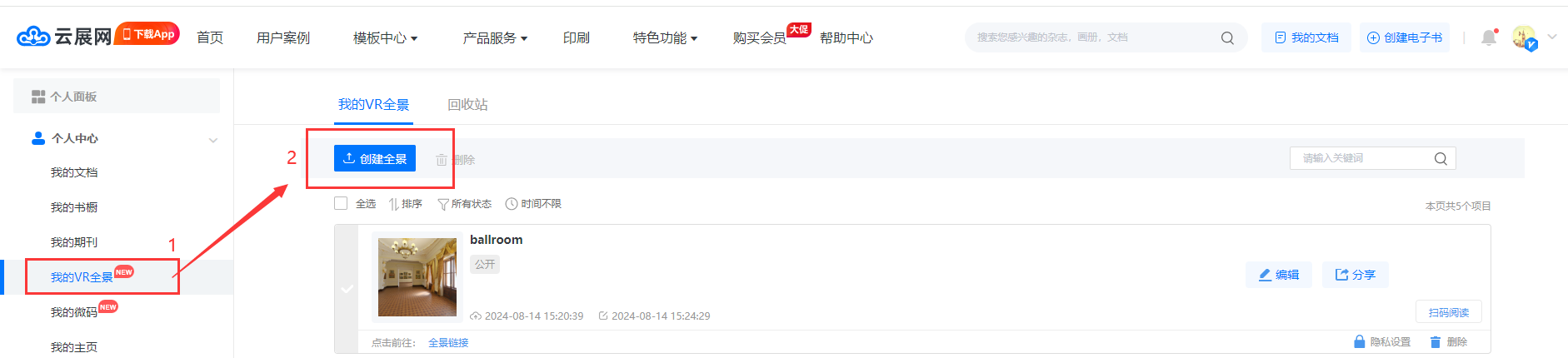 在【我的VR全景】页面,点击【创建全景】进入编辑页面