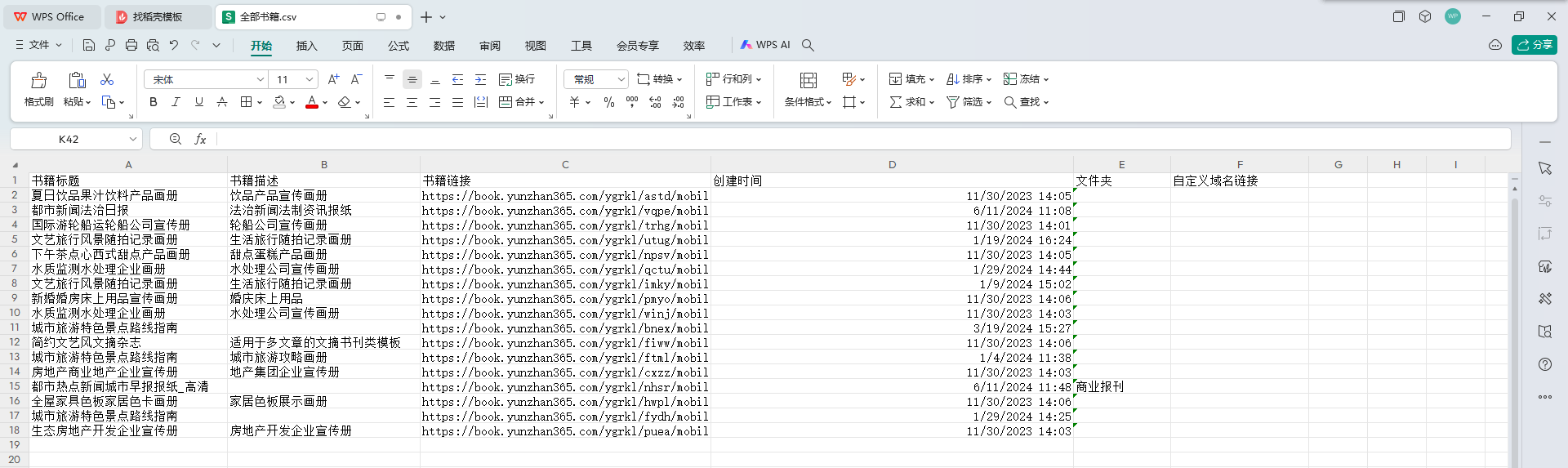 点击【我的文档】,点击【导出】后,选择导出所有书籍的链接或者二维码,导出链接会得到一份excel表格,表格会显示每一本电子书的标题、描述、链接以及创建时间,选择导出二维码会得到一份压缩包,解压之后即可查看所有书籍的二维码。