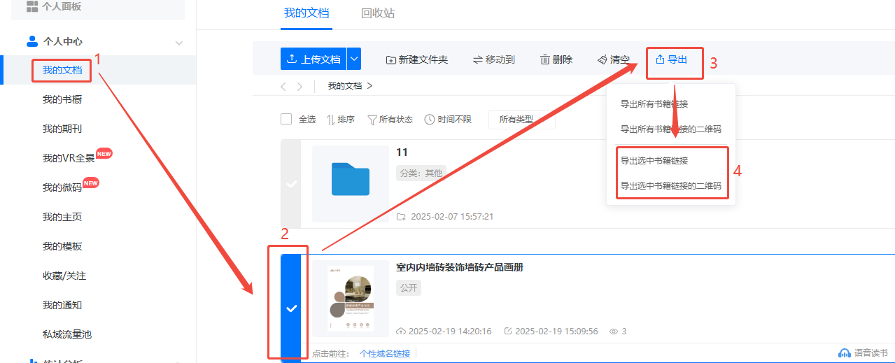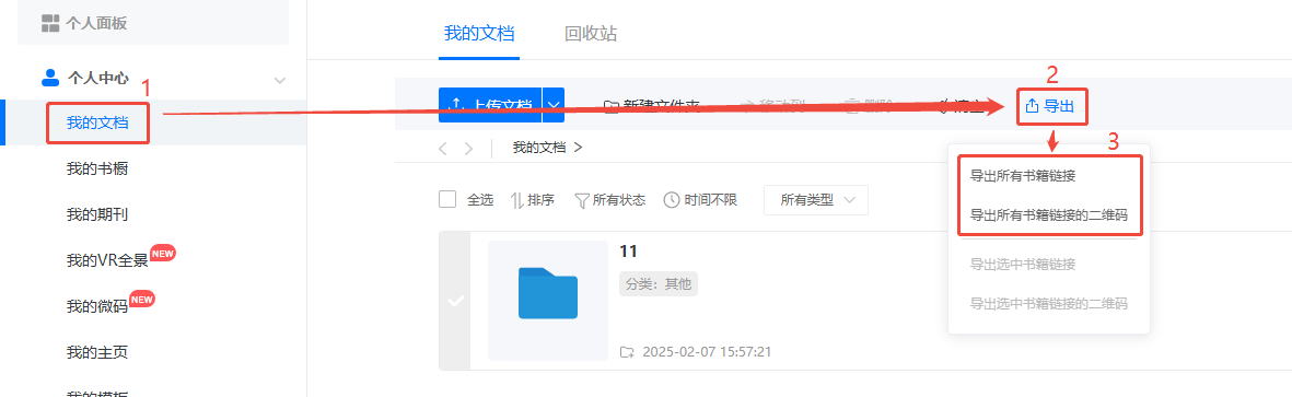 点击【我的文档】,勾选需要导出的书籍,点击【导出】后,选择导出选中书籍的链接或者二维码,导出链接会得到一份excel表格,表格会显示每一本电子书的标题、描述、链接以及创建时间,导出二维码会得到一份压缩包,解压之后即可查看所选书籍的二维码。