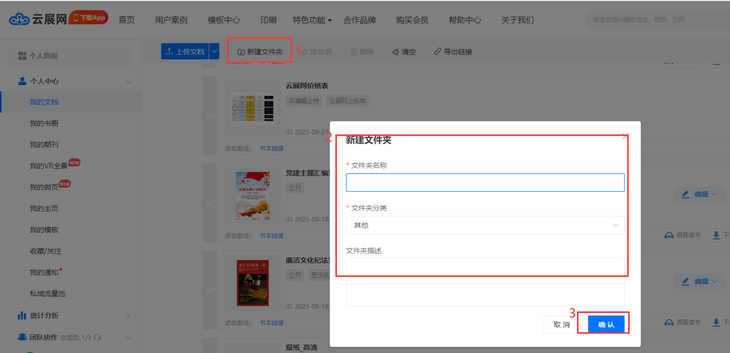 在【我的文档】页面–点击【新建文件夹】–输入文件夹信息–点击【确认】