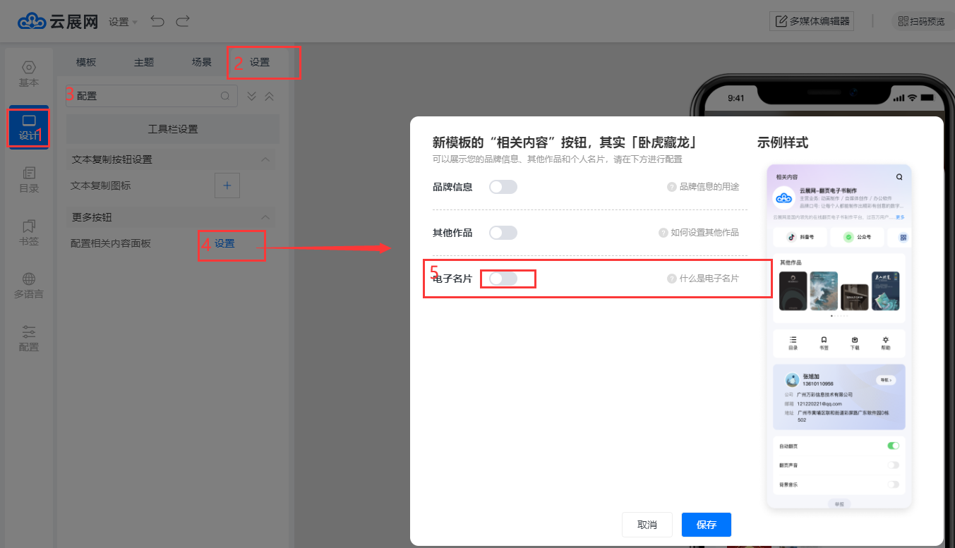 点击【设计】,点击【设置】,在搜索栏输入”配置”关键字查找,点击【配置相关内容面板】设置,开启电子名片功能