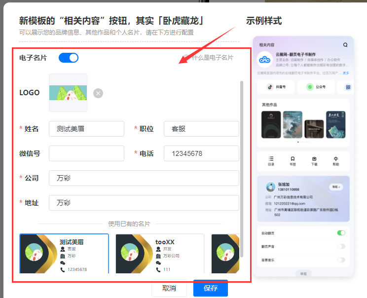 电子名片是指添加您的logo图、姓名、职位、微信号,电话等信息形成电子名片,展示在相关内容面板上,可以快速地与潜在客户建立联系,提高沟通效率和响应速度。