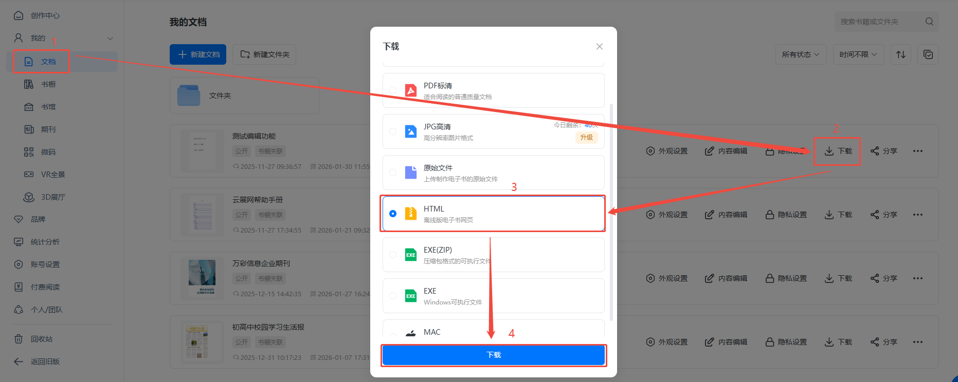 点进【文档】,找到对应电子画册,点击【下载】,选择下载HTML格式。
