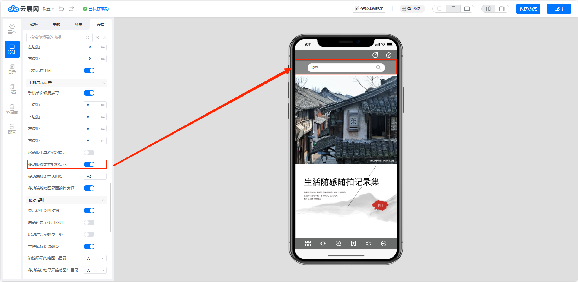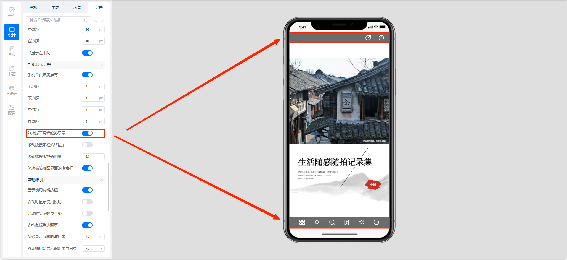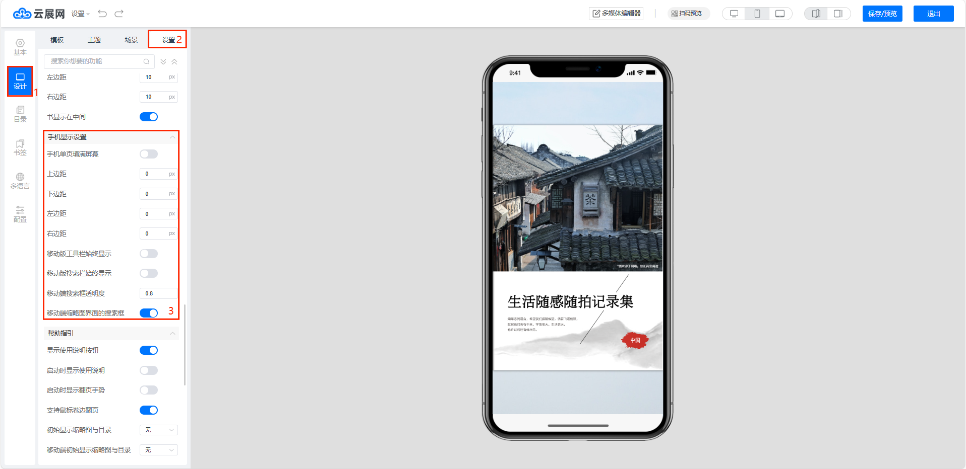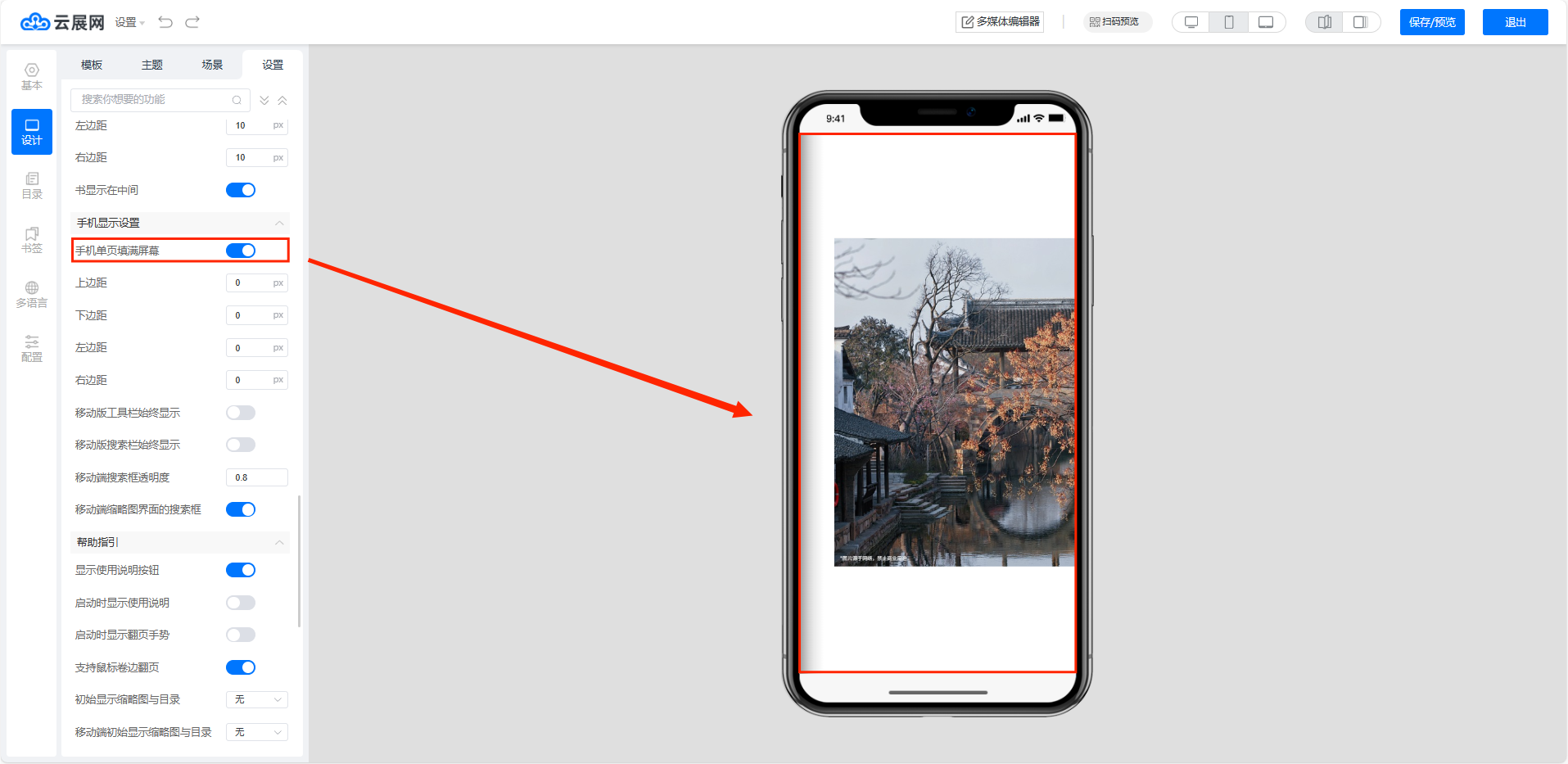 点击【设计】中的【设置】,找到【手机显示设置】,根据你的需求修改上下左右的边距数值以及勾选显示设置。