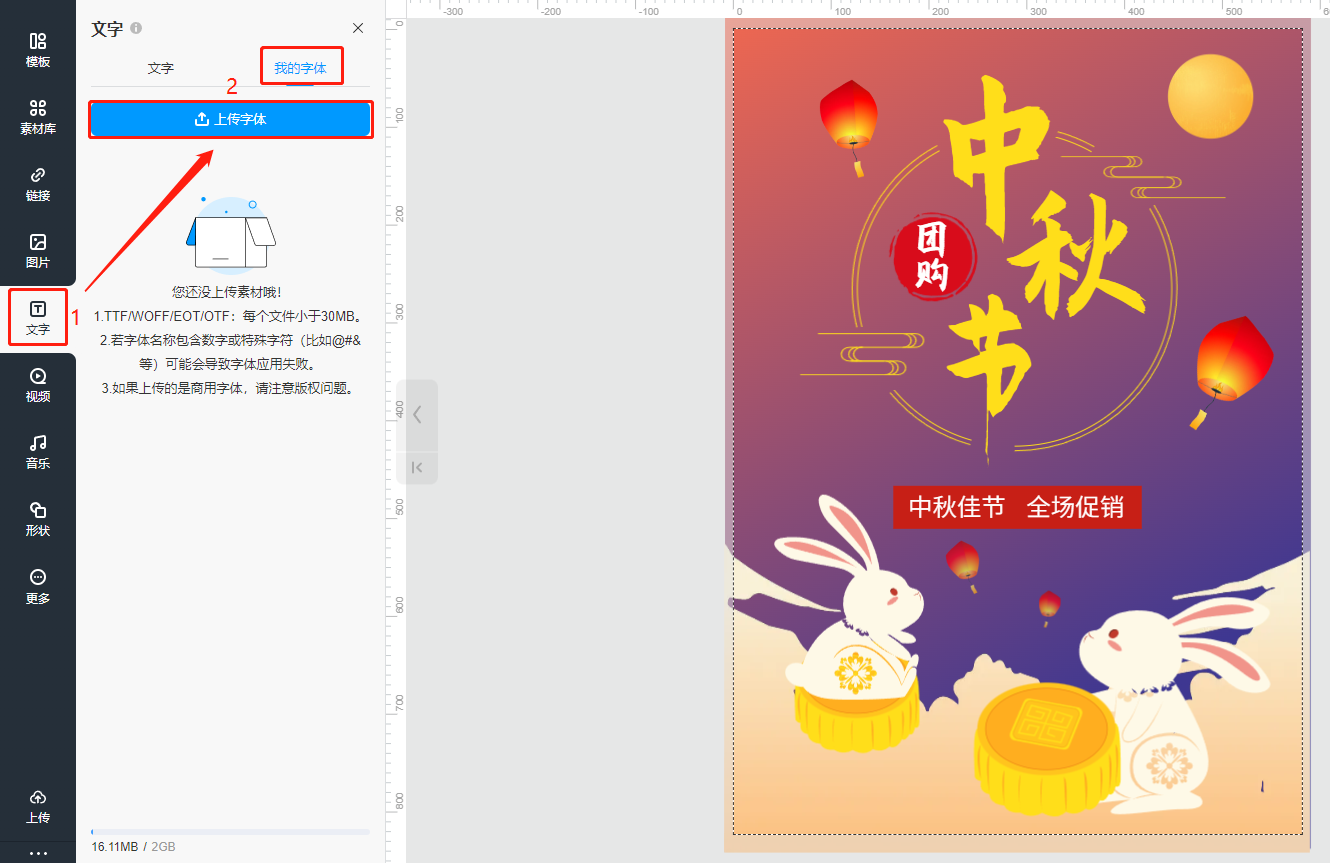 (1)可上传的文件格式为:TTF/WOFF/EOT/OTF,文件大小需小于30M。