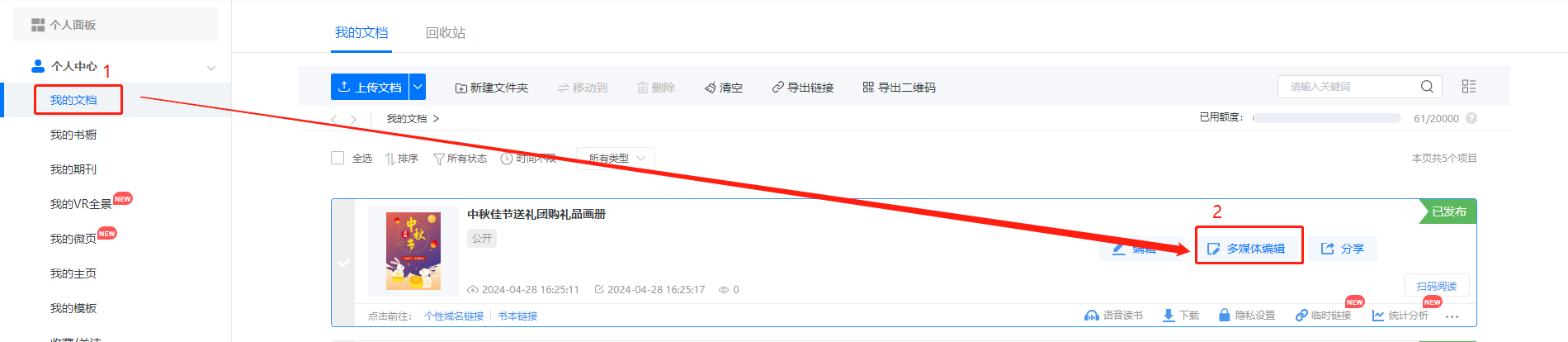 点进【我的文档】/【文档】,选择对应电子书,点击【多媒体编辑】/【内容编辑】。