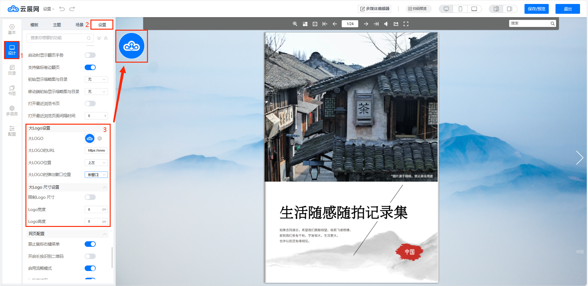 点击【设计】中的【设置】,找到【电脑端书边距】,添加LOGO、设置LOGO的链接、位置以及尺寸大小。