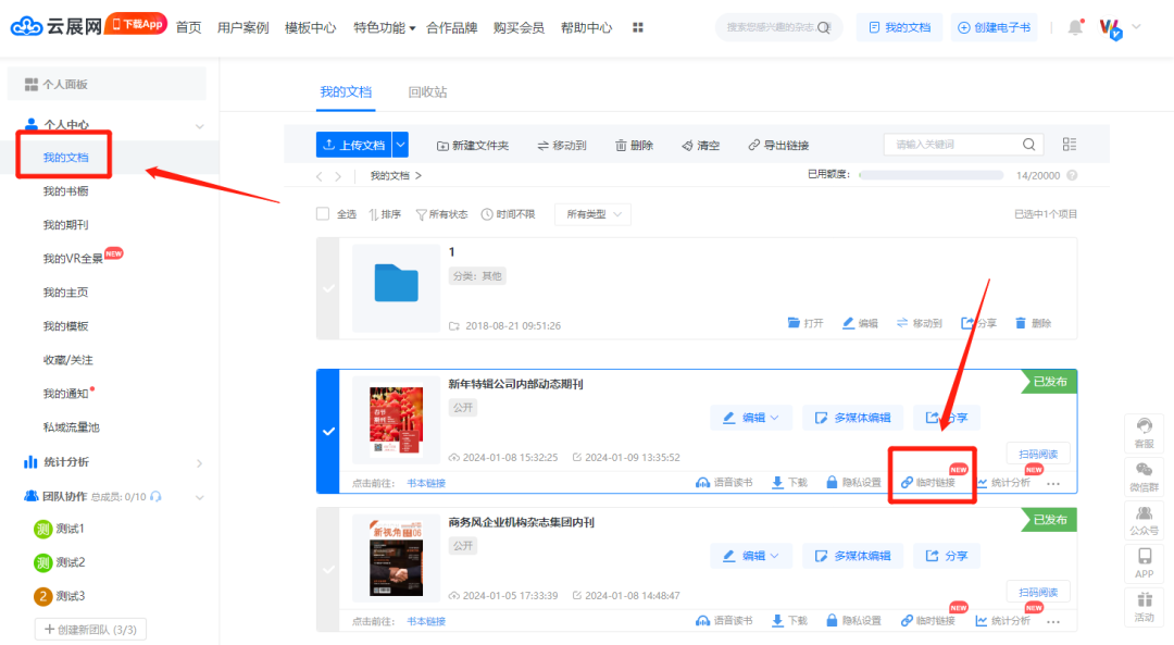 1、点击“我的文档”选择需要设置的电子画册,点击下方“临时链接”可进行设置。