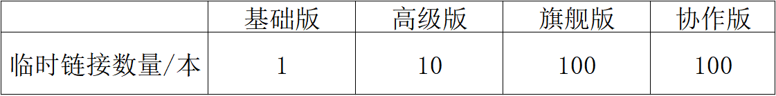 温馨提示:“临时链接”功能需基础版及以上会员才可使用,各版本对于每本书可创建的临时链接数量不不同,如图: