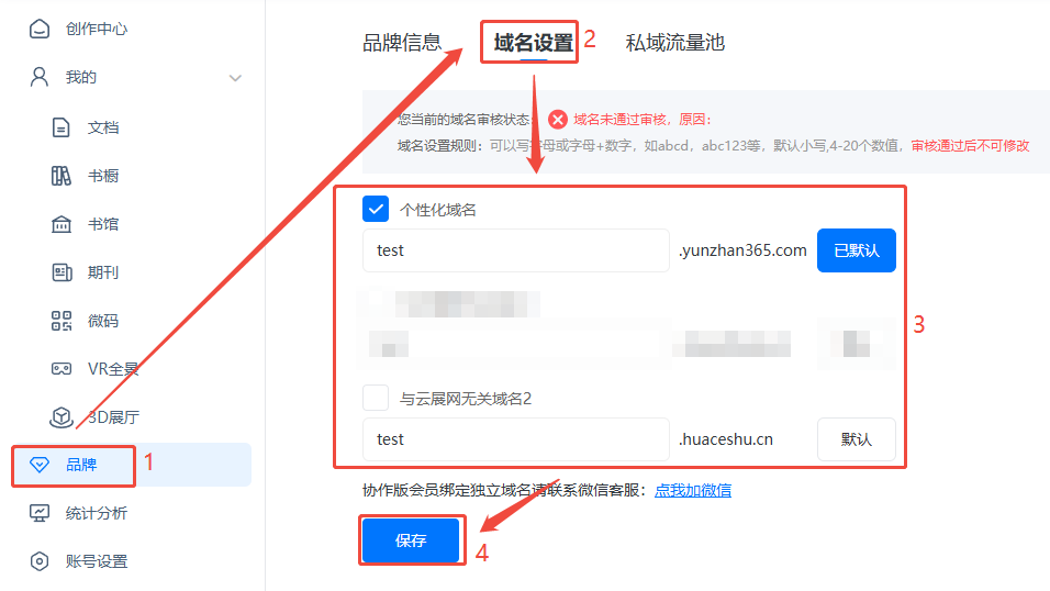 1、点进【品牌】,然后点击【域名设置】,勾选域名类型,在空白框填入您需要显示的域名,点击【保存】。