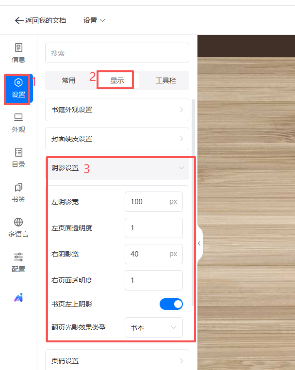 如何自定义页面阴影? 一、功能介绍 阴影就是书籍两页中间的阴影效果。 效果如图: 二、操作步骤 1、打开外观设置界面 在【文档】页面,找到对应的电子书选,点击【外观设置】。 2、电子书阴影设置 点击【设置】,点击【显示】,找到【阴影设置】打开,设置左阴影宽、右阴影宽、页面阴影透明度数值以及书页左上阴影、翻页光影效果类型。如果不想要阴影或者您有些双页是一张大图不需要显示阴影,可以设置页面阴影透明度数值为0。