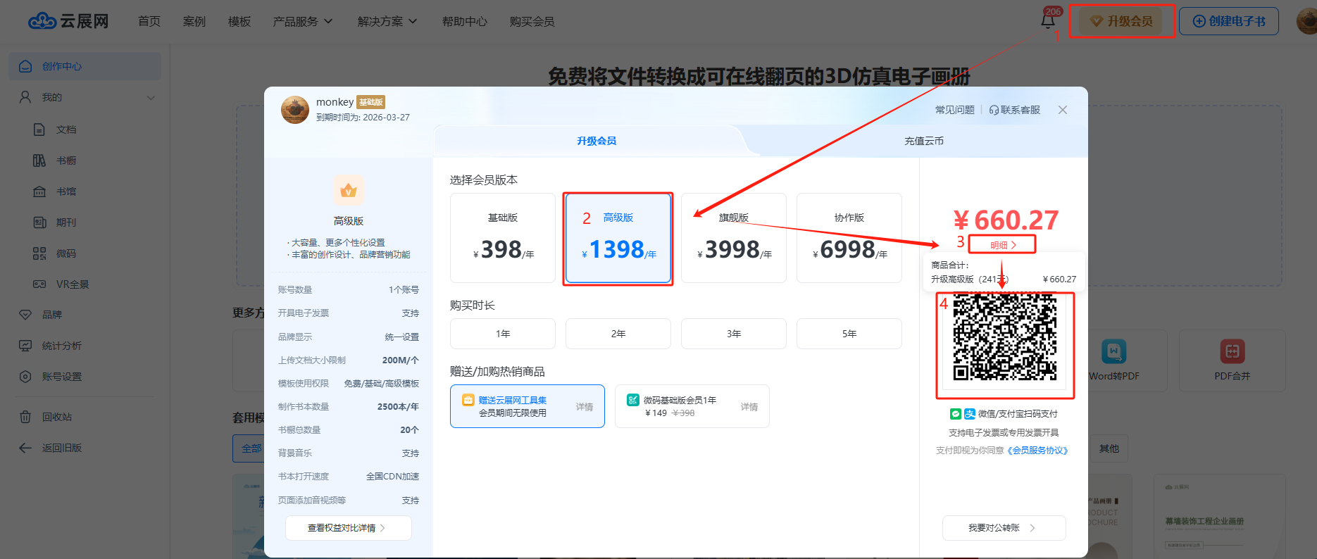 用户只需要补交会员剩余天数费用即可升级会员版本,例如基础版升级高级版: