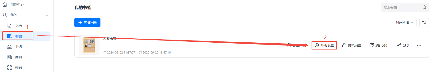 a)点击【书橱】找到对应书橱,点击【外观设置】,进入管理书橱界面。