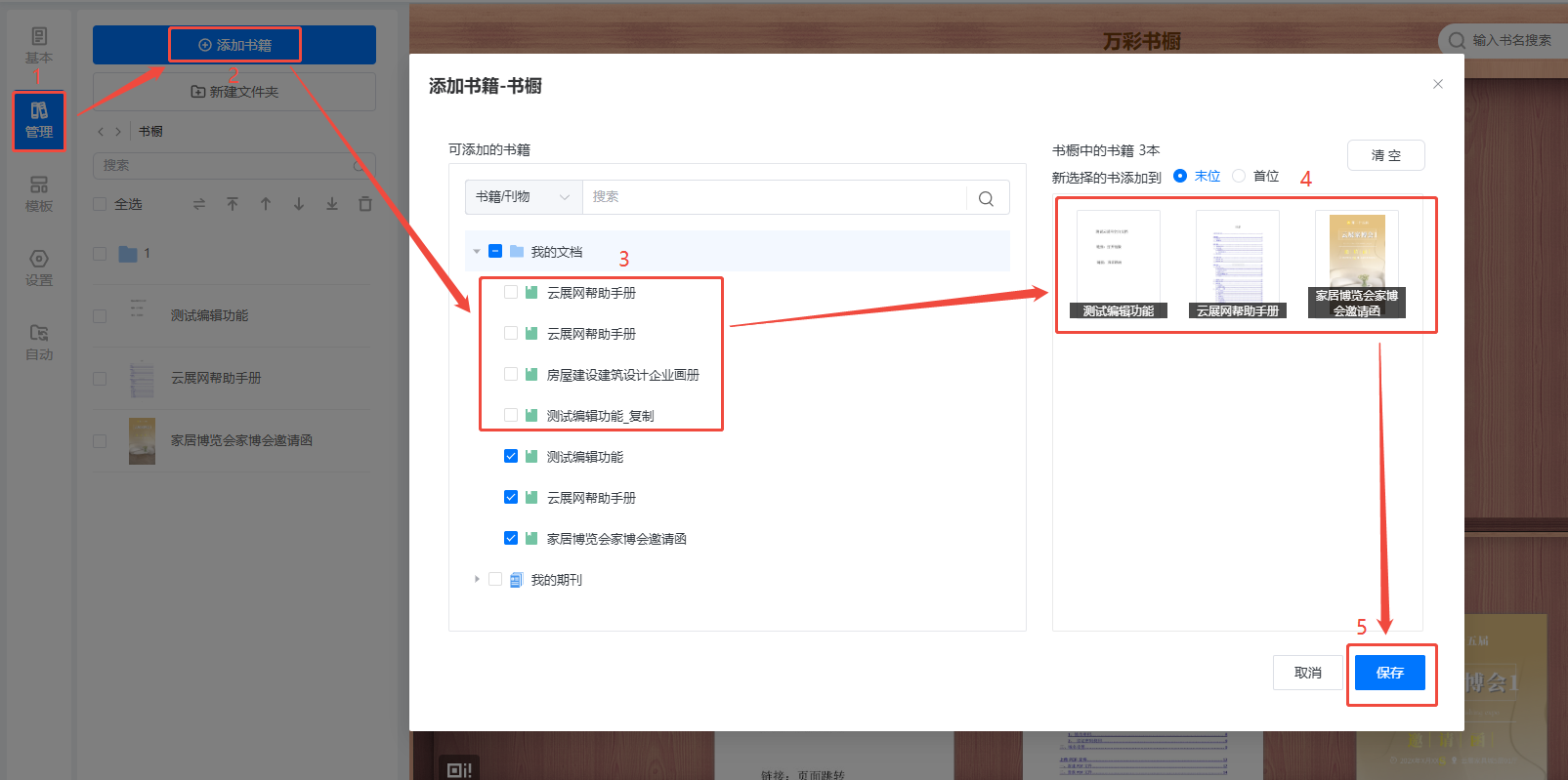b)先点击【管理】,再点击【添加书籍】,勾选需要添加的书籍,点击保存。