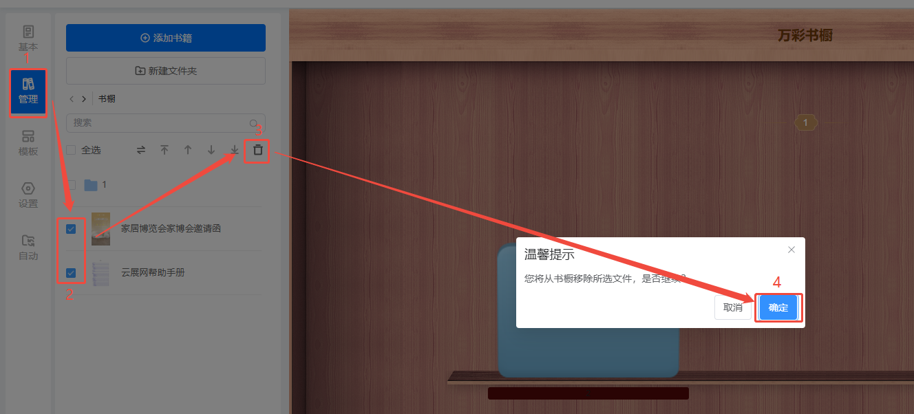 b)先点击【管理】,勾选需要移除的书籍,点击垃圾桶图标,最后点击确定即可移除书籍。