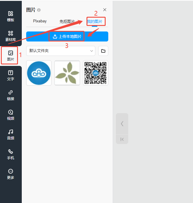 (1)点击【图片】,然后点击【我的图片】,再点击【上传本地图片】并选择电脑上的图片文件。