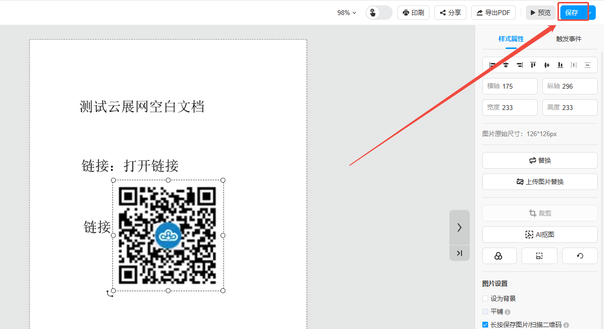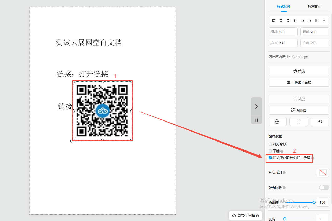 在内容编辑里把二维码/小程序图片添加到电子画册页面上,并勾选可识别按钮,那么读者在阅读您的电子画册时,就可以“长按识别”打开您电子画册页面上的二维码或小程序了。