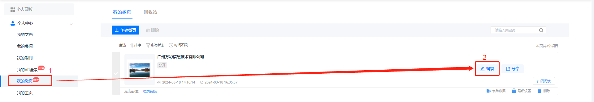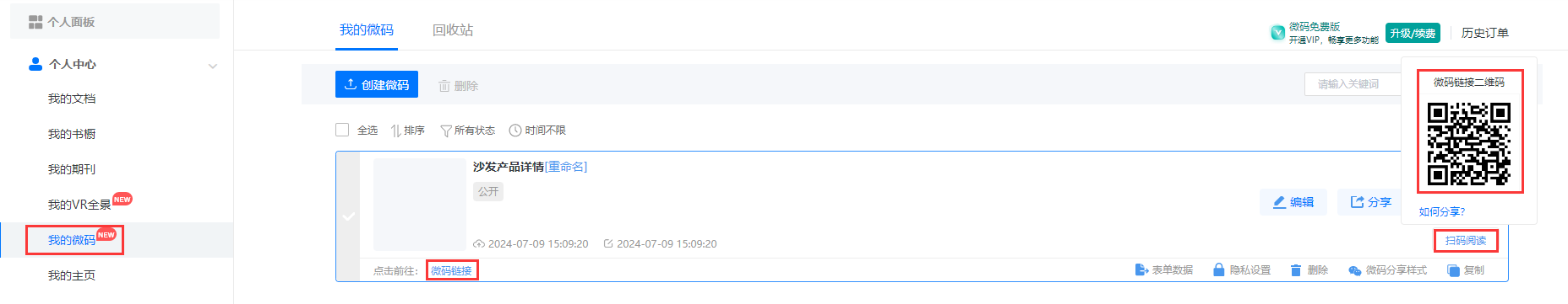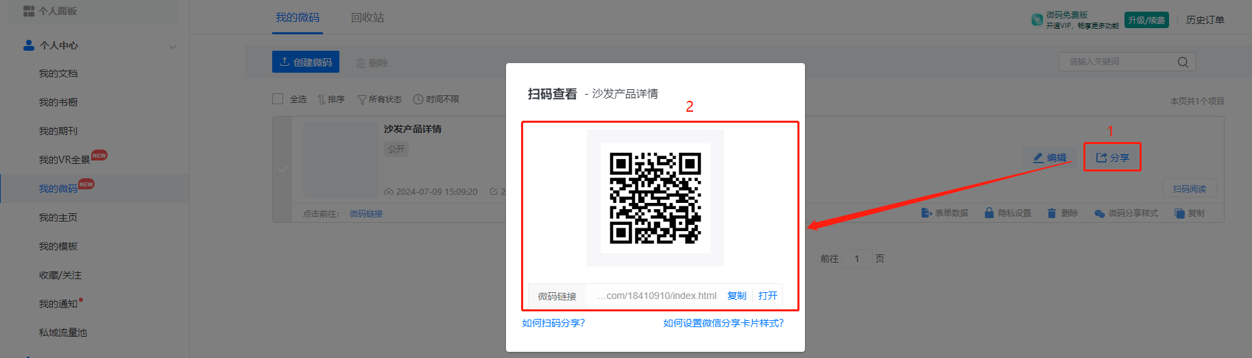 如何获取微码链接二维码用于分享? 一、功能介绍 每一个做好的微码都会有独立的链接和二维码,可以将链接或者二维码发到其他社交平台,方便宣传,一共有两种获取方式。 二、操作步骤 1、账号后台 (1)点击【我的微码】,【微码链接】可以获取链接,【扫码阅读】可以获取二维码。 (2)点击【我的微码】,然后点击【分享】,即可获取链接和二维码。 2、编辑器内 (1)点击【我的微码】,然后点击【编辑】,打开编辑器。 (2)右侧获取二维码和链接。