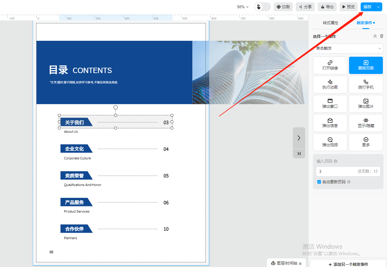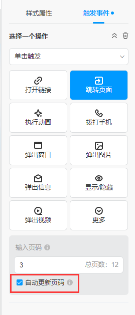 打开【触发事件】,【跳转页面】,设置需要跳转的页码(页码从第一页开始计算)。