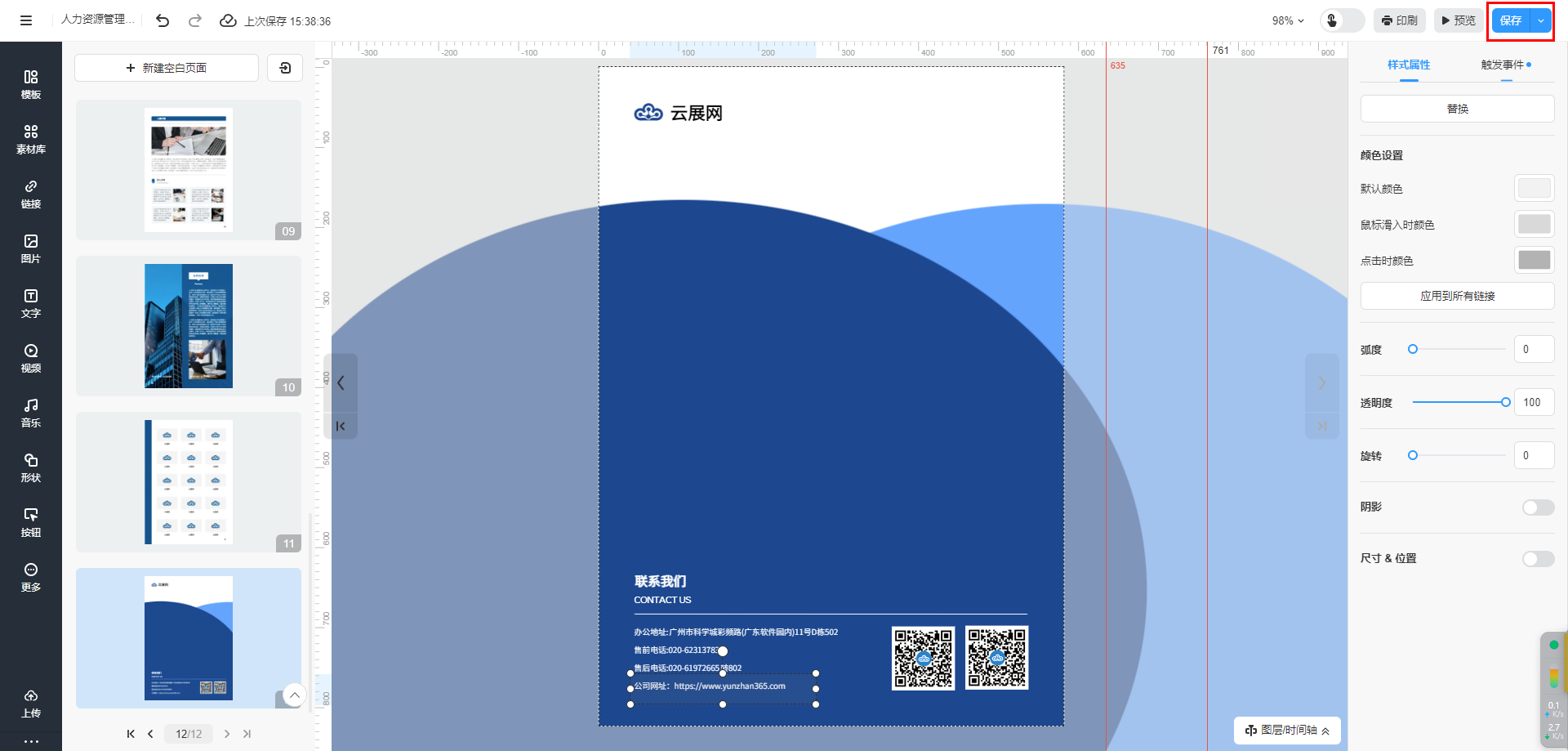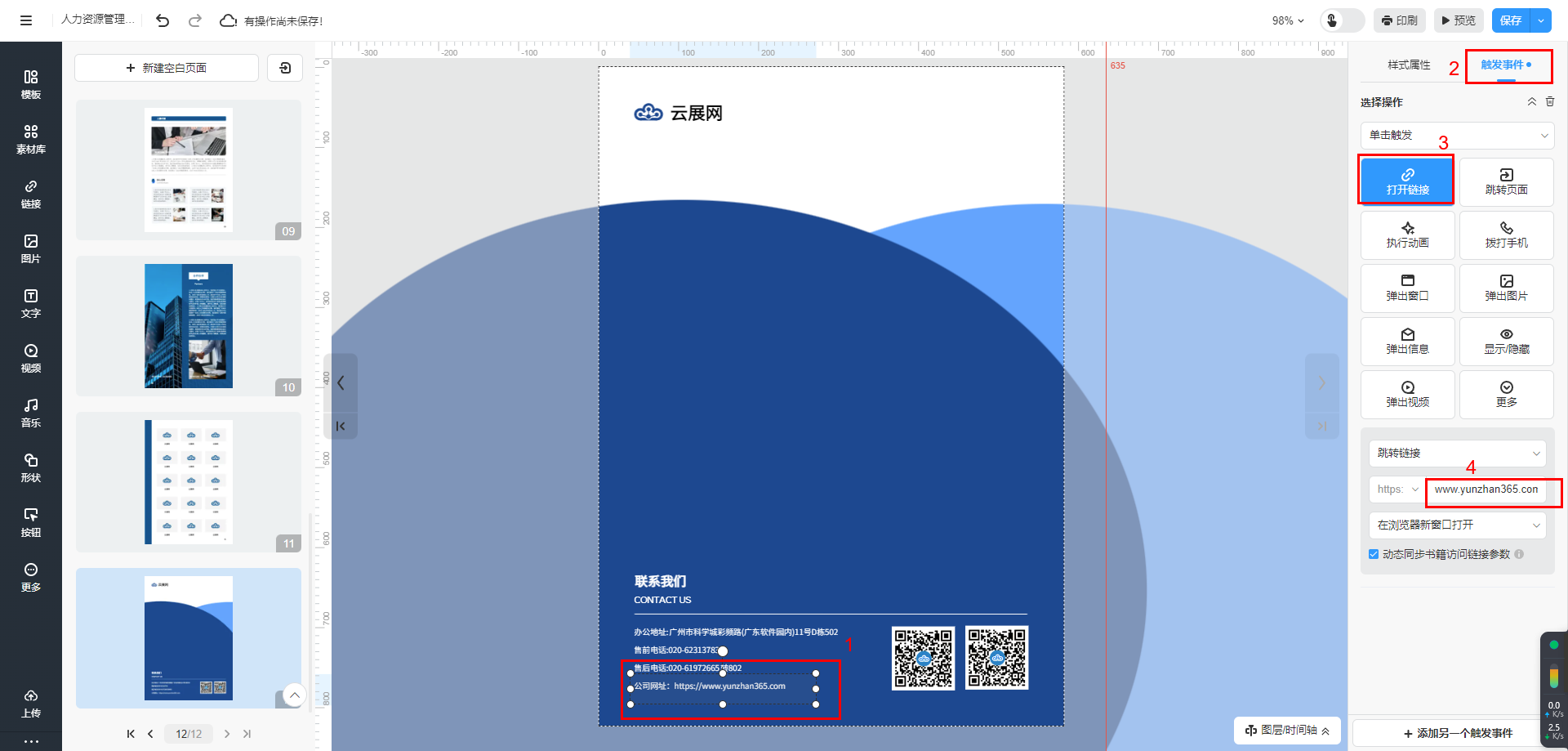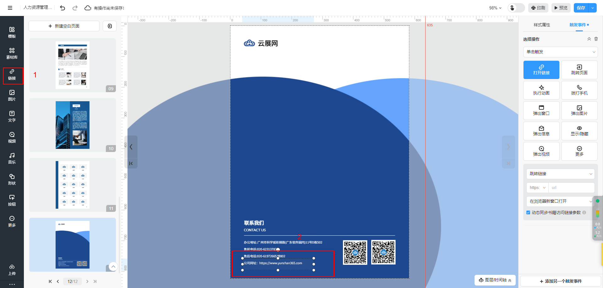 (2)在右边设置面板,点击【触发事件】,选择【打开链接】动作并且输入跳转链接。