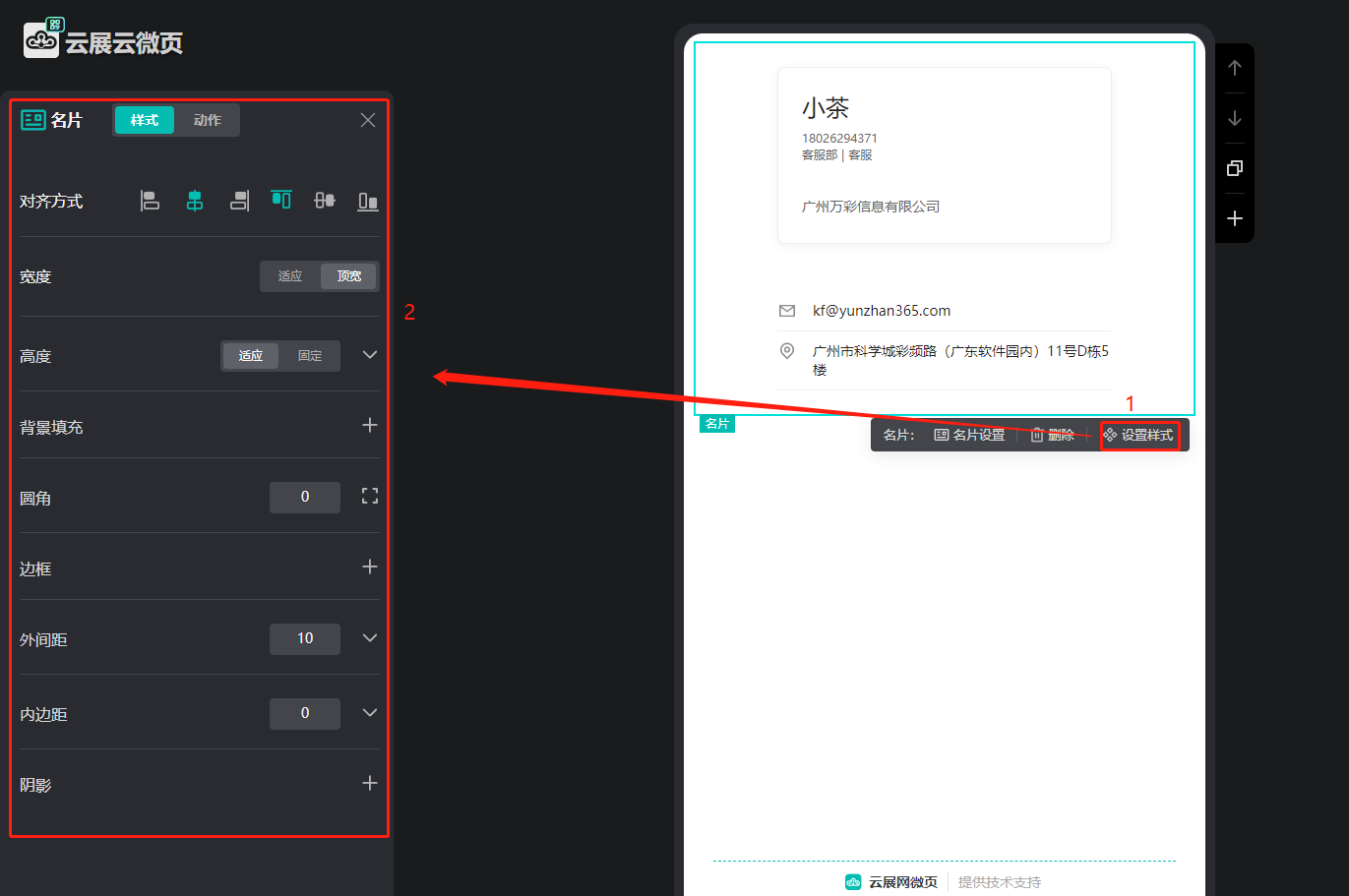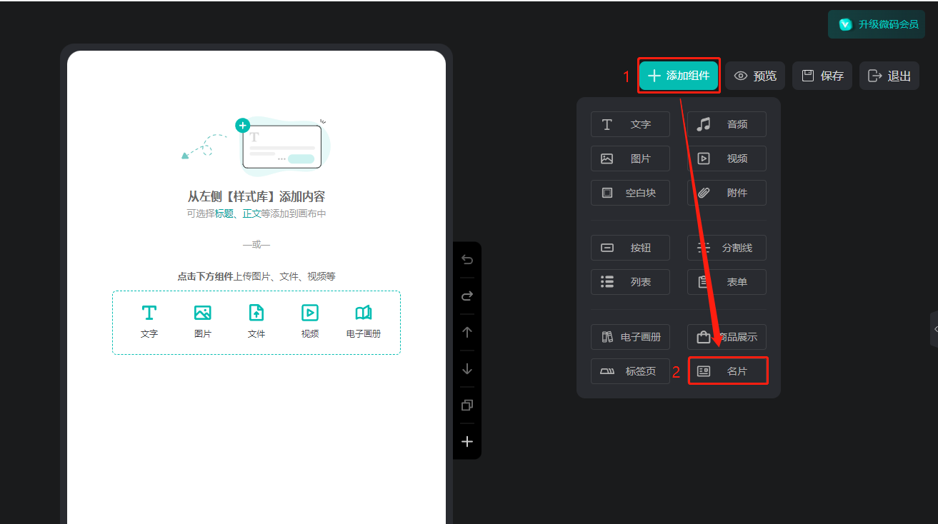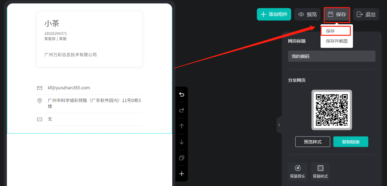 如何在微码上设置电子名片? 一、功能介绍 电子名片是指添加您的logo图、姓名、职位、微信号,电话等信息形成电子名片,展示在微码上,可以快速地与潜在客户建立联系,提高沟通效率和响应速度。 二、操作步骤 1、打开微码的编辑器 点击【我的微码】,点击需要操作的微码的【编辑】。 2、添加电子名片 点击【添加组件】,选择【名片】。 3、输入名片信息 输入名片信息,点击确认。 4、设置名片样式 点击【设置样式】,在左侧设置名片样式。 5、保存 点击右上角保存。