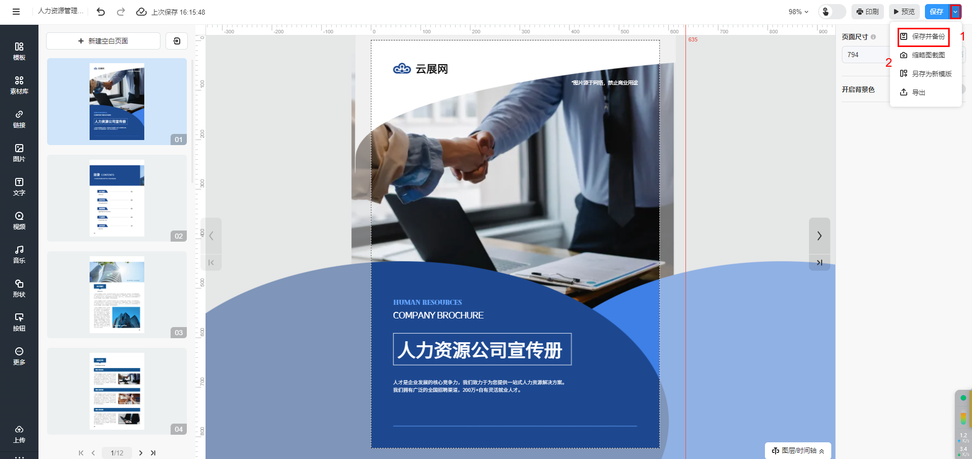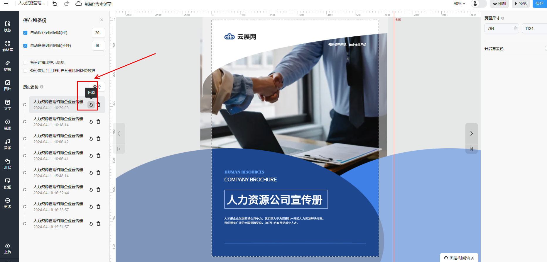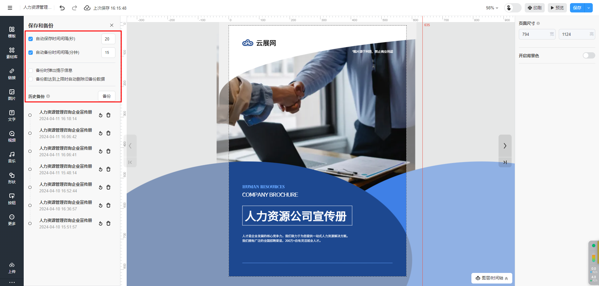 所有设置完成以后,在编辑器右上角点击【保存并备份】。