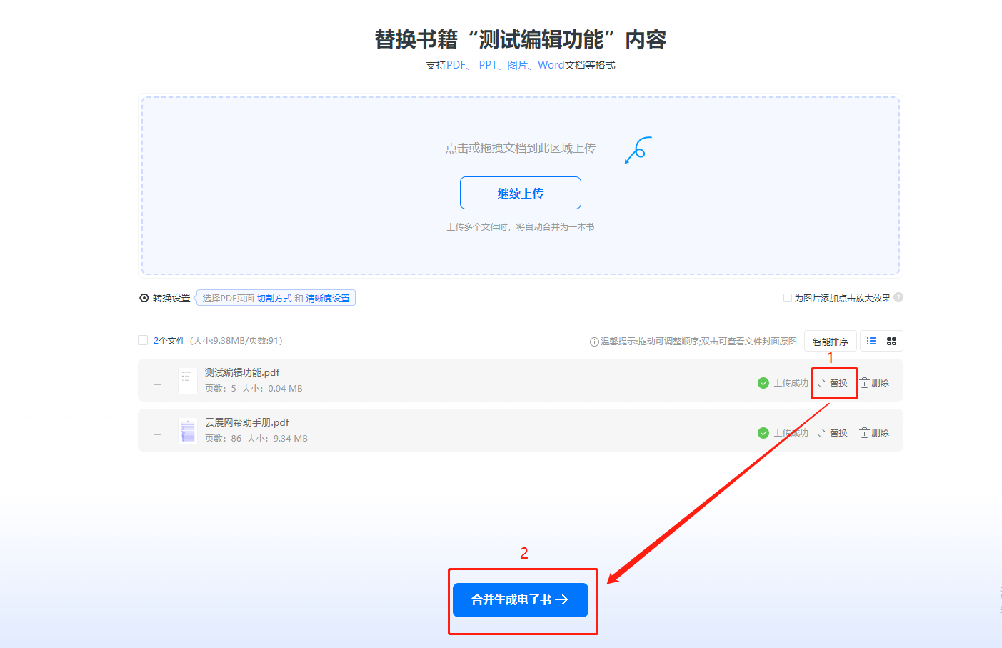 如果之前上传的是多个文件,点击替换,把旧文件替换成新文件,然后点击【合并生成电子书】。