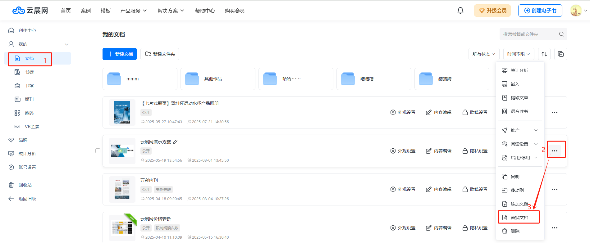 进入【文档】页面,选择需要替换内容的书本,点击右边三个点,点击【替换文档】,进入替换文档界面。