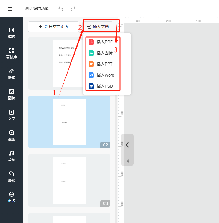 选择需要替换的页面,点击【插入文档】,选择要插入的文件类型,然后点击选择文件上传新文件,再选择需要插入的文件进行转换。