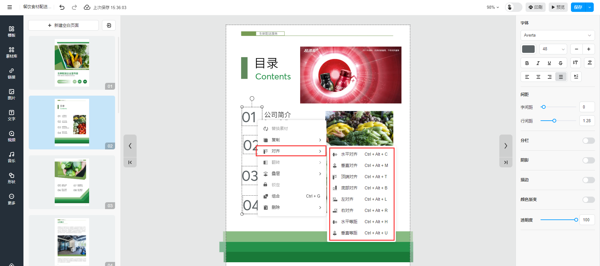 设置文本框对齐方式 一、功能介绍 当页面中有多个素材/文本框需要对齐时,可以通过设置文本框的对齐方式,轻松地将页面内容整齐排列。 二、操作步骤 1.进入编辑器界面 点进【我的文档】/【文档】,选择对应电子书,点击【多媒体编辑】/【内容编辑】。 2、设置对齐方式 按住键盘“ctrl”,鼠标单击选择需要对齐的素材/文本框,然后右键点击,选择【对齐方式】 3、保存查看效果 点击右上角的【保存】即可