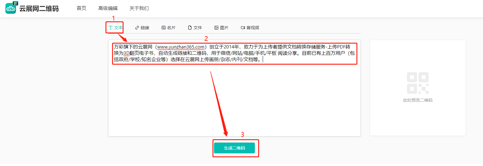 (1)点击【文本】,下方输入文案,点击【生成二维码】。