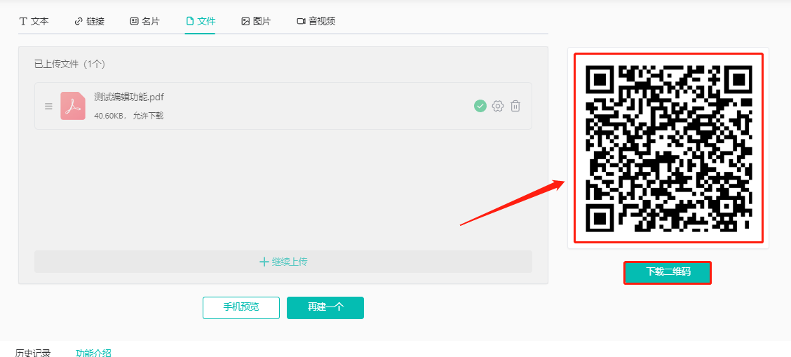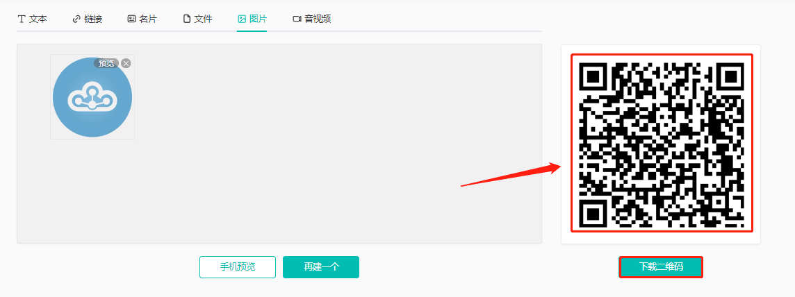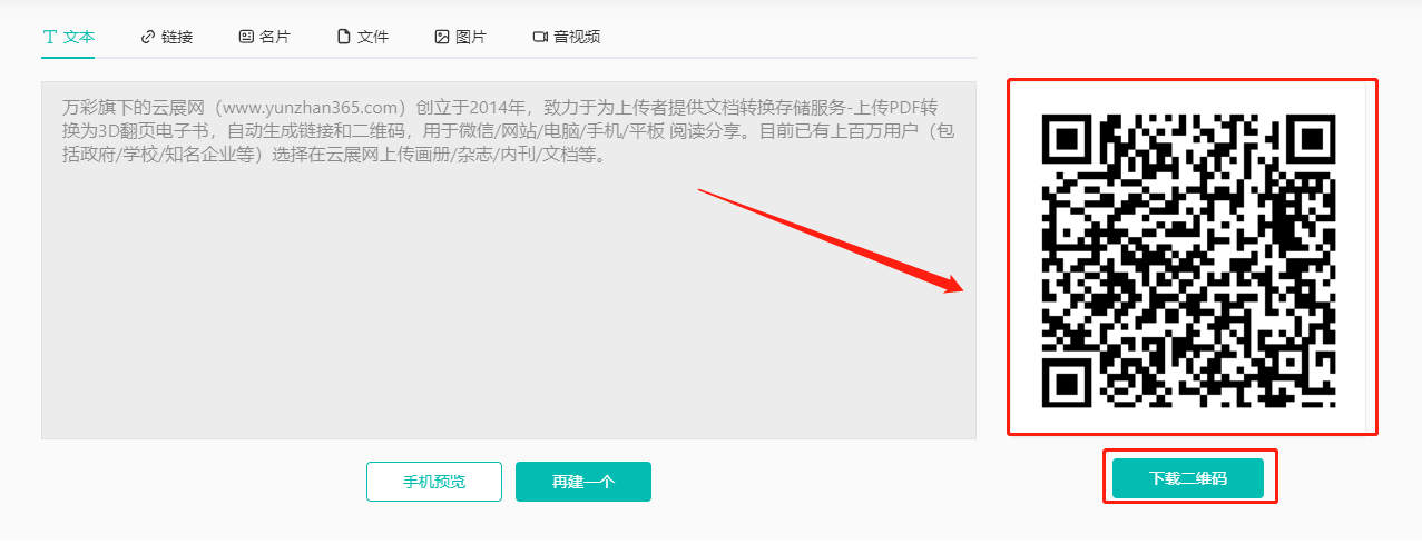 多功能二维码生成器可以将文本、链接、名片、文件、图片、音视频,转换为一个二维码,手机上随时随地扫码观看。