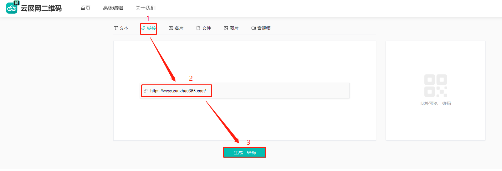(1)点击【链接】,下方输入链接,点击【生成二维码】。
