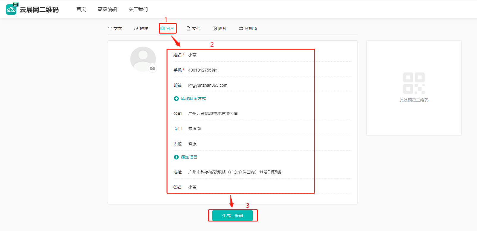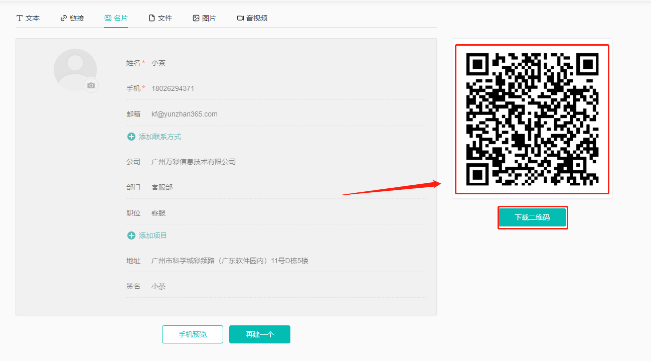 (1)点击【名片】,下方输入名片信息,点击【生成二维码】。
