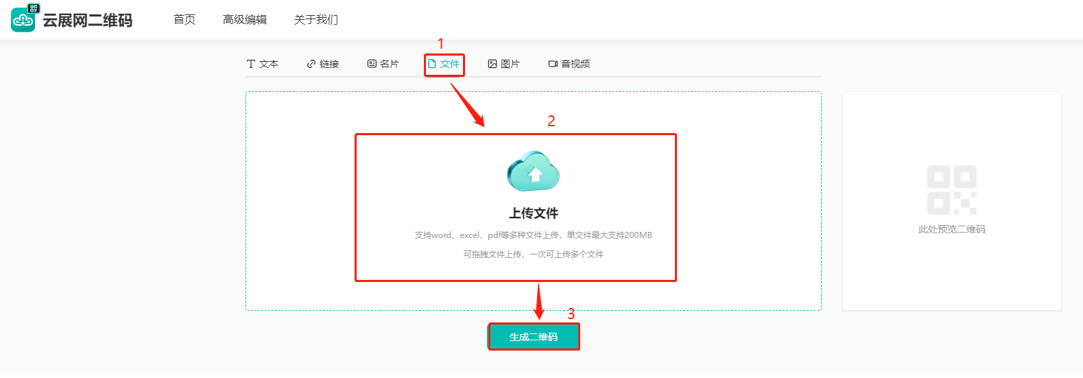 (1)点击【文件】,然后点击下方【上传文件】上传文件,点击【生成二维码】。