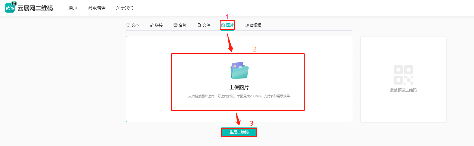(1)点击【图片】,然后点击下方【上传图片】上传图片,点击【生成二维码】。