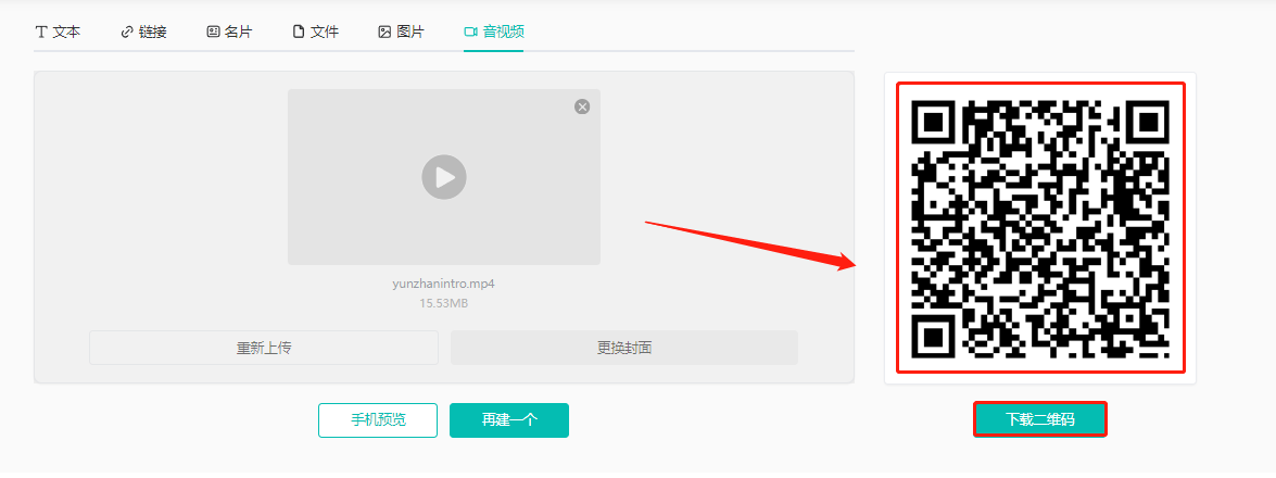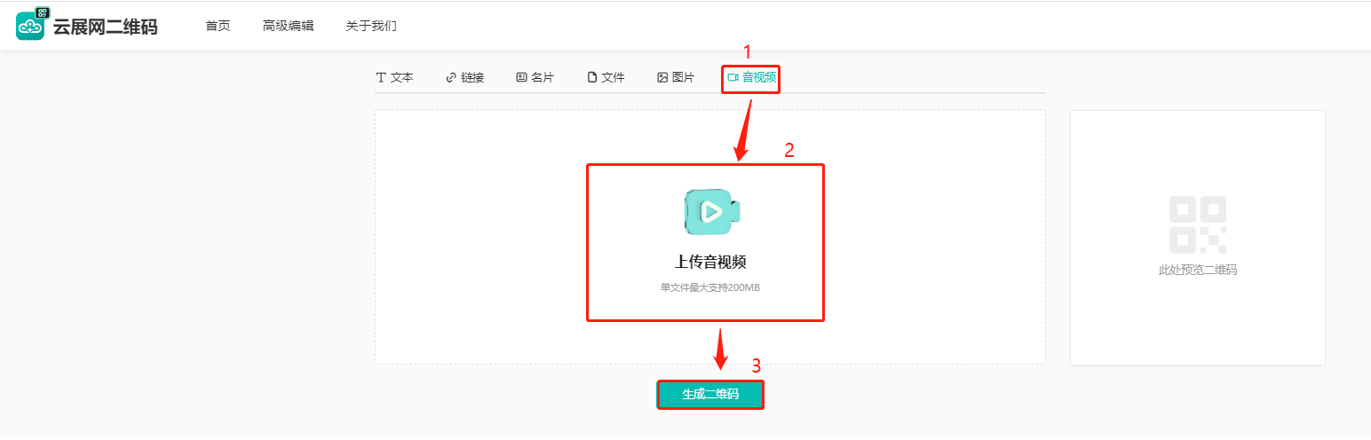 (1)点击【音视频】,然后点击下方【上传音视频】上传音频或者视频文件,点击【生成二维码】。