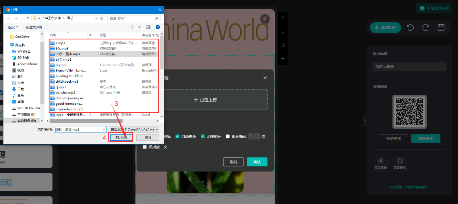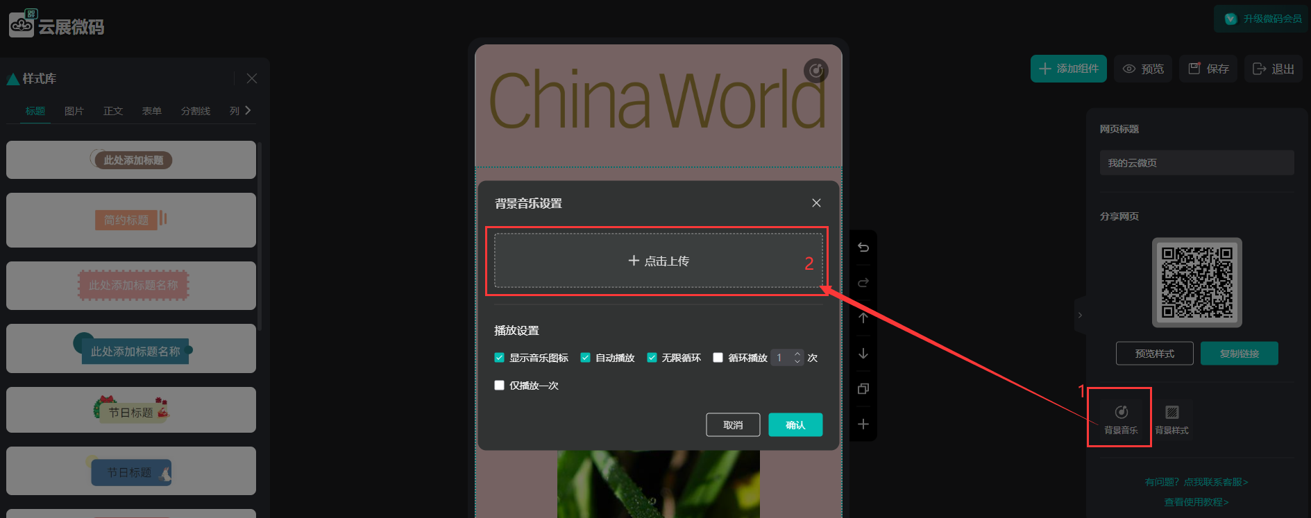 点击【背景音乐】,【点击上传】,上传MP3格式的音乐文件