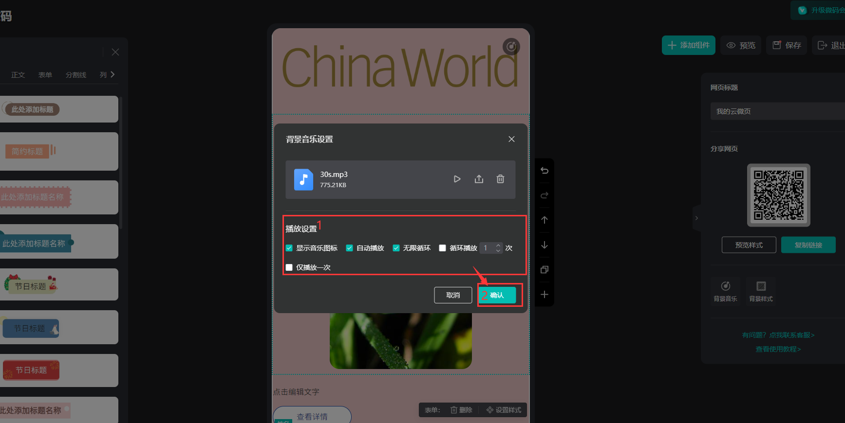 【循环播放多少次】:设置播放多次背景音乐,比如设置2次,打开微码可播放2次背景音乐
