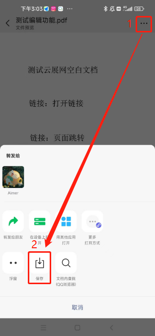 先将文件发到微信上并打开,点击右上角三个点,点击【保存】,文件便会保存到手机相应的路径上。