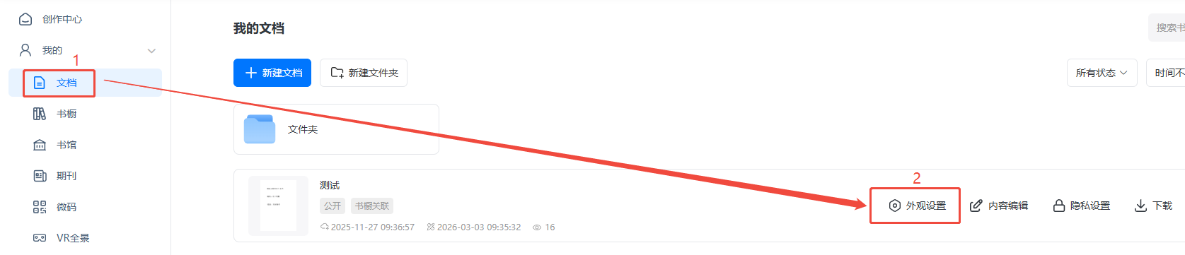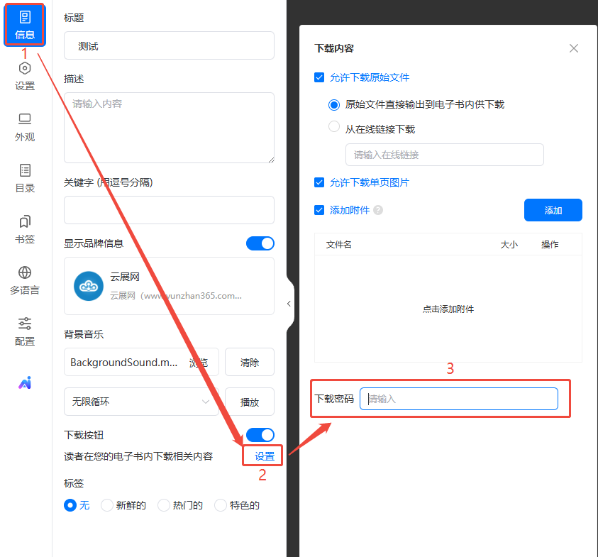 如何设置下载密码? 一、功能介绍 此项功能可以给下载按钮设置一个密码,读者下载文件的时候需要输入正确的密码才能下载。 二、操作步骤 1、打开外观设置 点进【文档】,找到对应电子画册,点击【外观设置】。 2、设置下载密码 点击【信息】,然后点击下方的【设置】,在右侧【下载密码】输入密码即可自动保存。